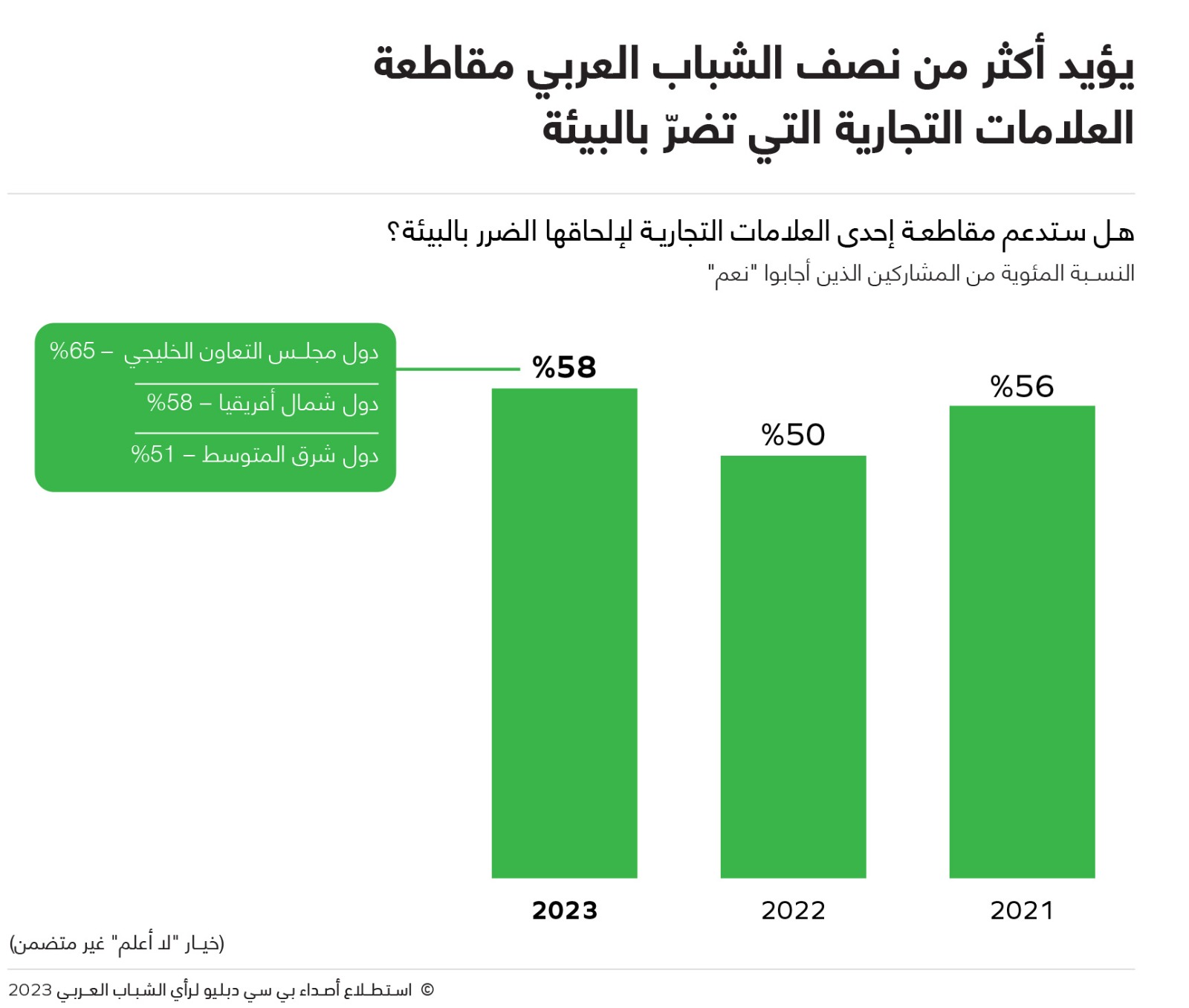 كشف استطلاع أصداء بي سي دبليو السنوي الخامس عشر لرأي الشباب العربي، والذي أصدرته “أصداء بي سي دبليو” – شركة استشارات العلاقات العامة الرائدة في منطقة الشرق الأوسط وشمال أفريقيا – أن أكثر من نصف (58%) الشباب العربي يؤيدون مقاطعة العلامات التجارية التي تلحق الضرر بالبيئة.