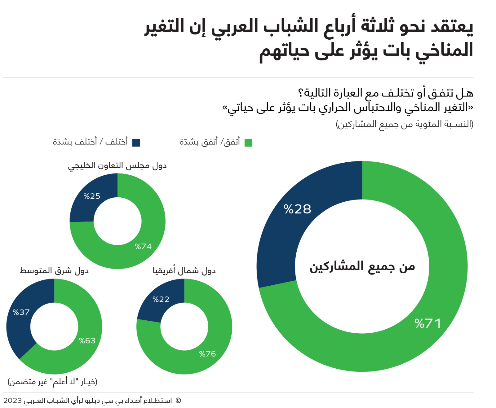 وتأكيداً على الانعكاسات المباشرة للتغير المناخي على المنطقة، يعتقد نحو ثلاثة أرباع (71%) المشاركين في استطلاع هذا العام أن الاحتباس الحراري بات يؤثر على حياتهم؛ وترتفع هذه النسبة إلى 76% في دول شمال أفريقيا و74% في دول مجلس التعاون الخليجي، فيما تصل إلى نحو الثلثين (63%) في دول شرق المتوسط.